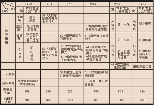 1961年9月,根据中央的八字方针,新生的山西矿业学院也进行了较大的调整。至1965年底,山西矿院保留两系即采煤系和机电系,三个本科专业即地下采煤、矿山机电和矿山机械制造工艺和设备,煤田地质勘探、选煤、煤炭综合利用及煤矿电子技术4个专业暂时停办。全院师生员工1079人,在校生726人,已毕业的本科生942人,专科生147人。在校教职工353人中有教师150人,占总数的42.5%,包括教授1人,副教授2人,讲师13人,助教123人,教员11人。