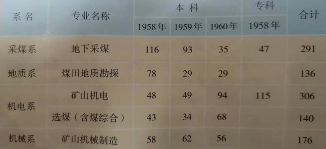 建院初期(1958-1960)山西矿院的系、专业设置及招生情况表